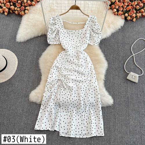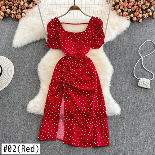 Y2k スリムフィットビーチホリデー背中開いた妖精セクシースクエアショートバブルスリーブスプリットレッドドットドレスボディコンベスト夏 サマー 夏物 スクウェア