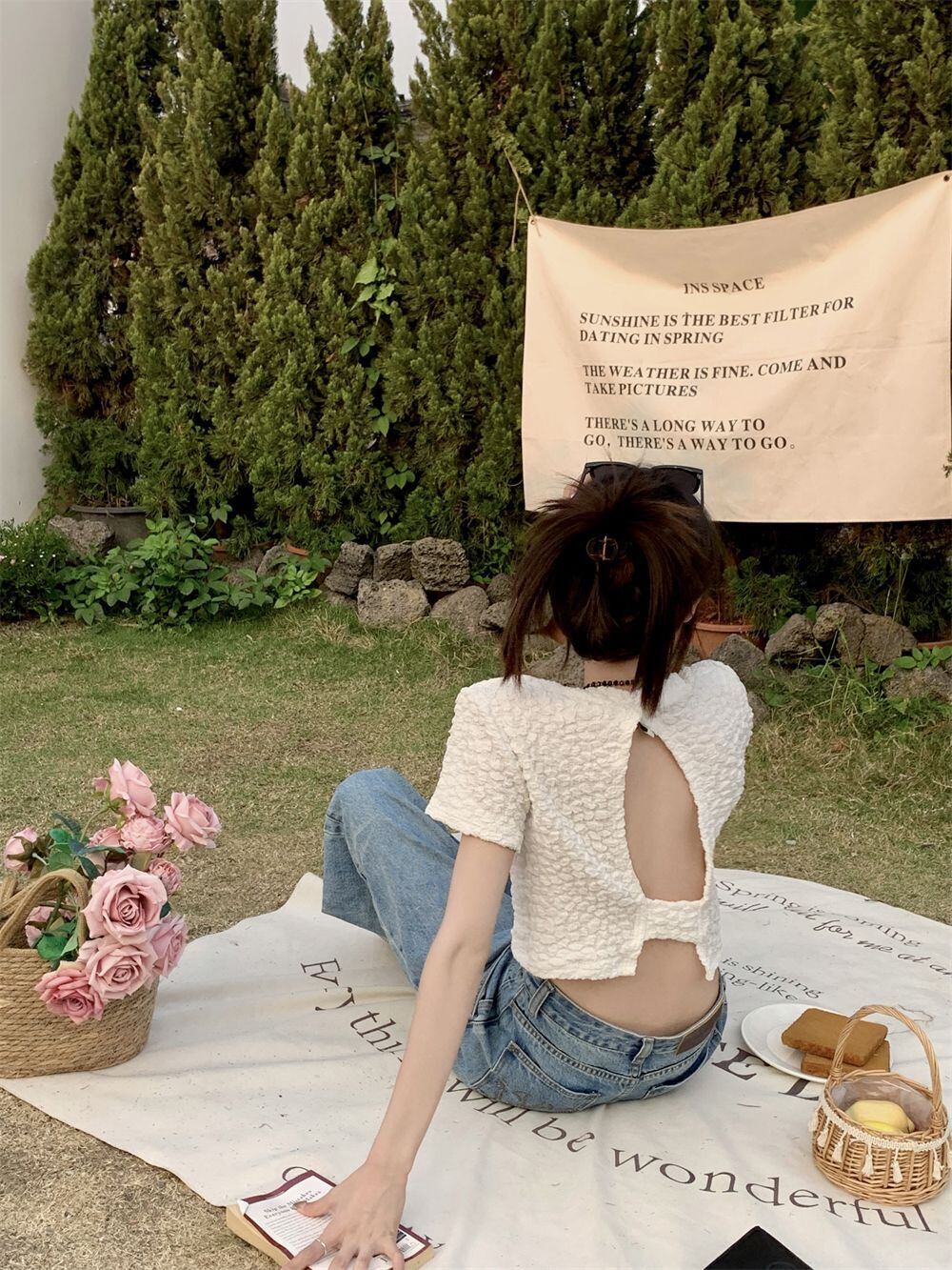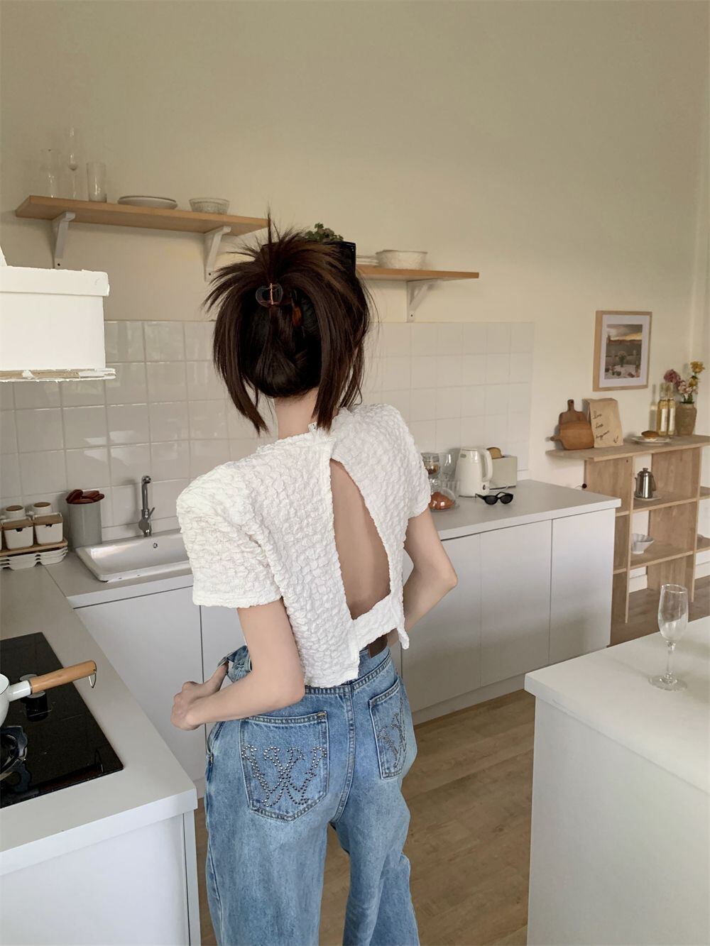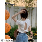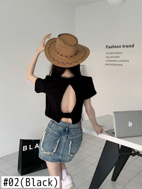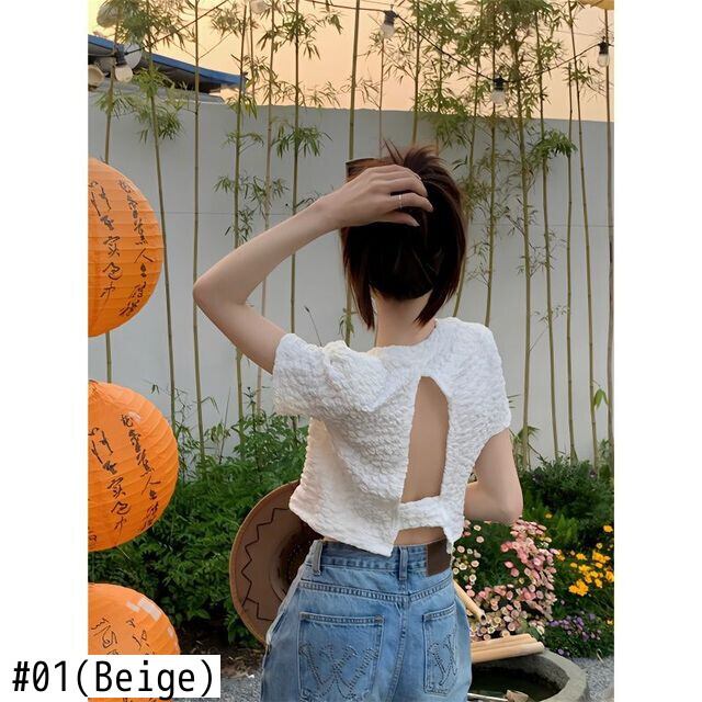 バックレスシャツプリーツ白シャツスリム半袖ブラウスデモーダサマーシャツ Tシャツ ショート ホワイト ハーフスリーブ 夏物