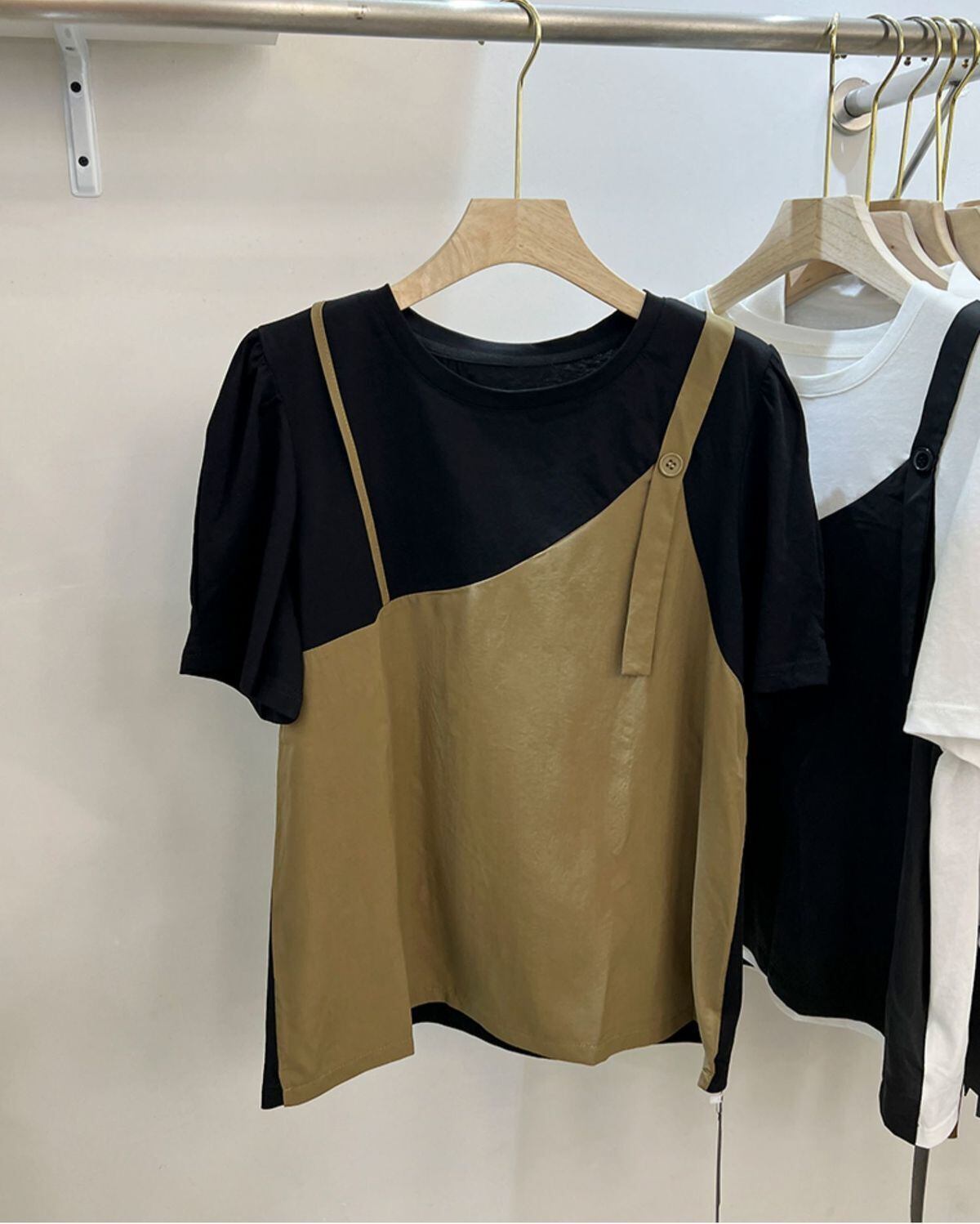 パッチワークフェイク 2 グラフィック Tシャツ特大グランジトップルーズハーフ Tシャツ綿ストラップ半袖 Tシャツ黒 Tシャツ ショート ブラック コットン ハーフスリーブ