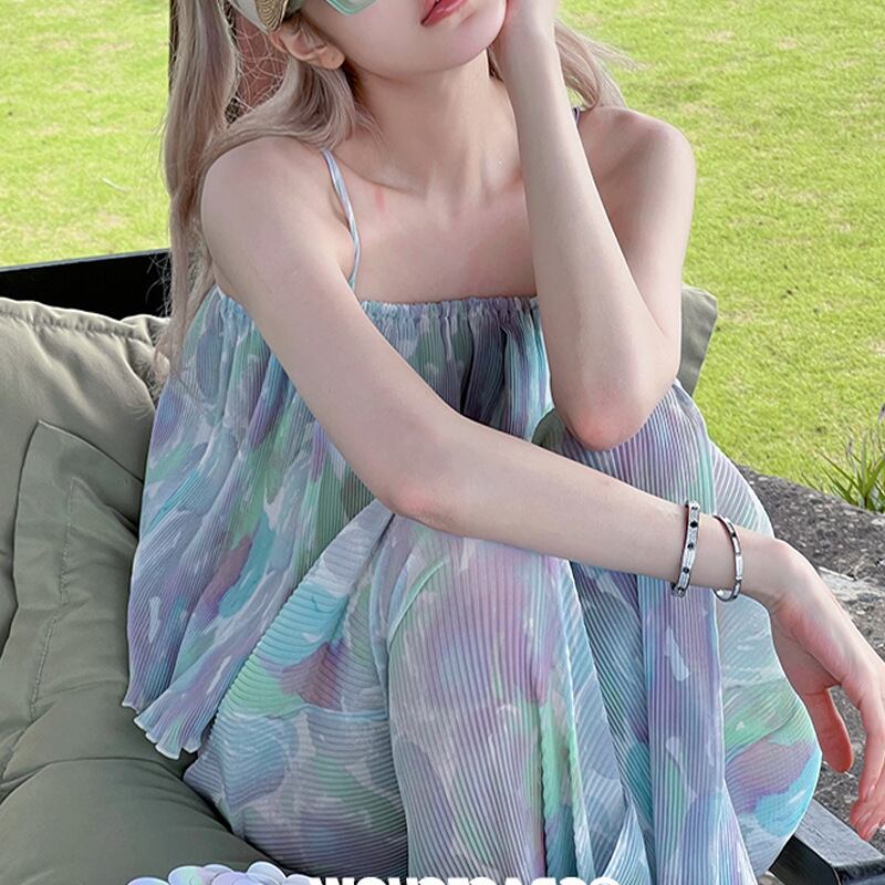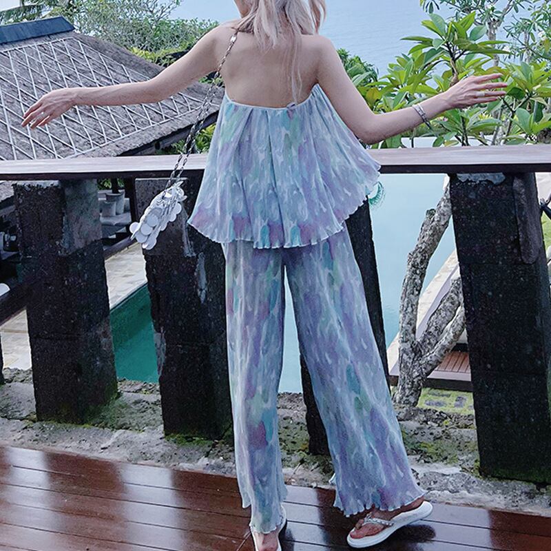 パンツセット トップス&Tシャツ タンク&キャミソール シフォンシャツ セクシークロップトップ ワイドレッグプリーツパンツ タイダイスーツ2セット ワイドパンツ