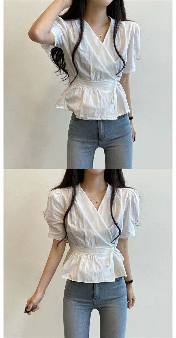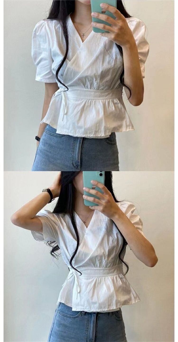 De moda V ネック白シャツバック弾性レースアップクロップトップス人形ブラウス Y2k Tシャツショート ホワイト エラスティック 伸縮 Vネック
