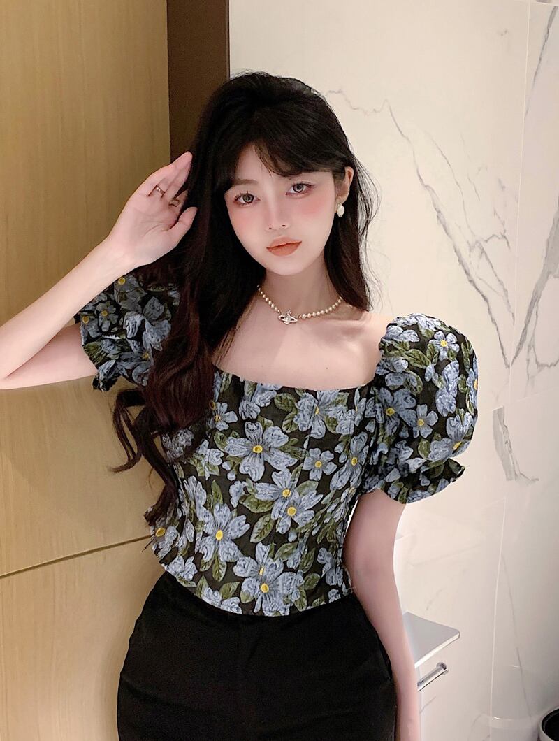 半袖クロップトップススクエアカラーシャツesスリムセクシーブラウスシャツ ショート ハーフスリーブ スクウェア