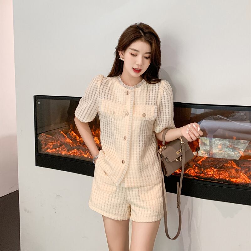 Conjuntos Curtos 夏服レースシャツポケットショーツセットシックチェック柄シャツ半袖 2 点セット ショート ハーフスリーブ サマー 夏物 ブルマー