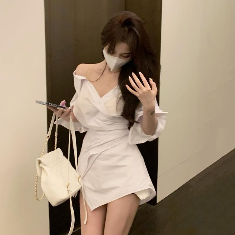 夏シャツドレス V ネックスリムフィットボタンウエスト半袖不規則膝上ドレス白ドレス ホワイト ハーフスリーブ サマー 夏物 Vネック