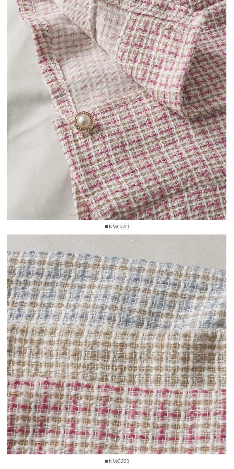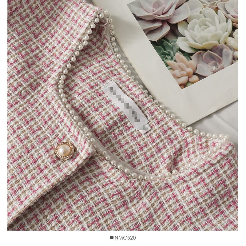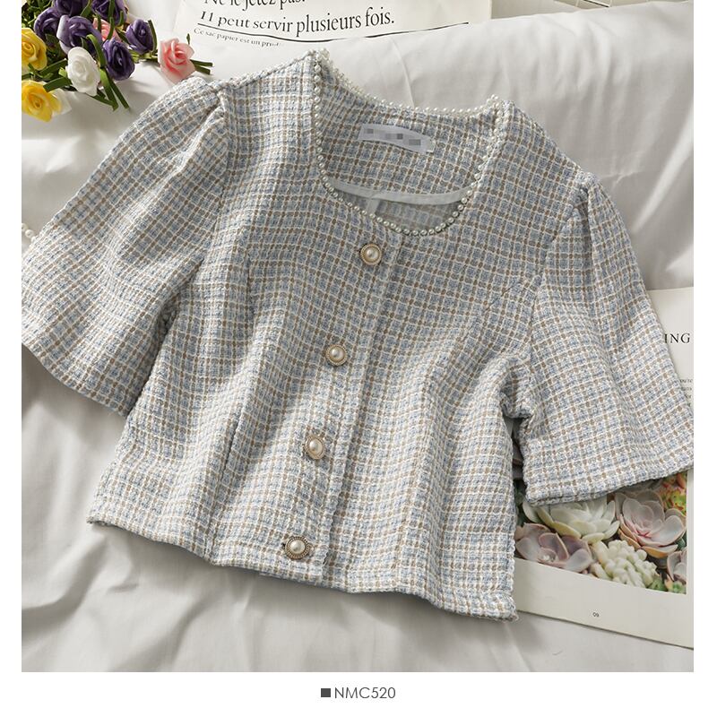 ビーズラウンド半袖ツイードトップシングルブレストカーディガンジャケットピンクチェック柄シャツクロップボタン ショート ハーフスリーブ
