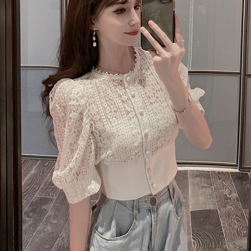 夏ブラウス中空アウトレース白人シャツ半袖ボタンルーズシャツトップス ショート ホワイト ハーフスリーブ サマー 夏物 ソリッドカラー