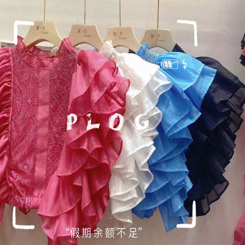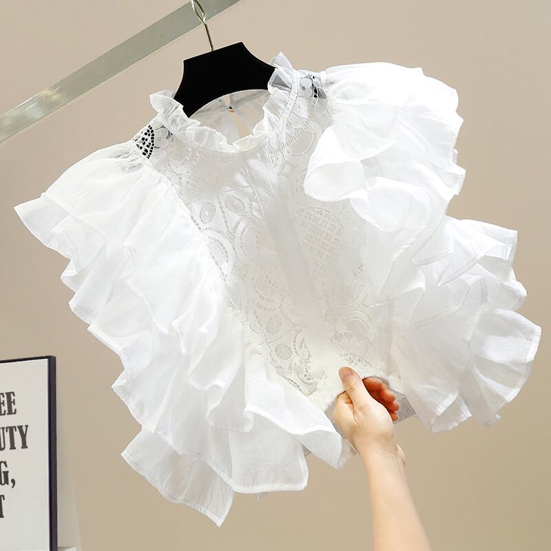 宮殿スタイルレトロブラックレースシャツ中空フライングスリーブブラウスデモーダセクシークロップトップ白シャツ ホワイト