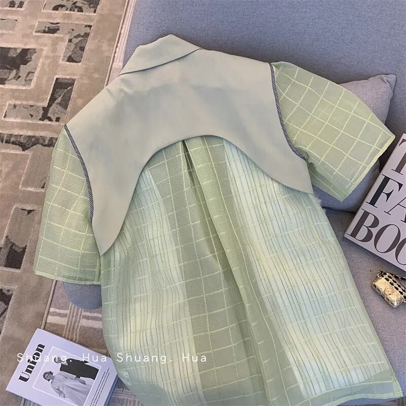 スカートセットノッチ半袖チェック柄シャツ 2 点セット衣装クロップトップススーツスリムブラウスショートパンツショーツセット ハーフスリーブ ブルマー