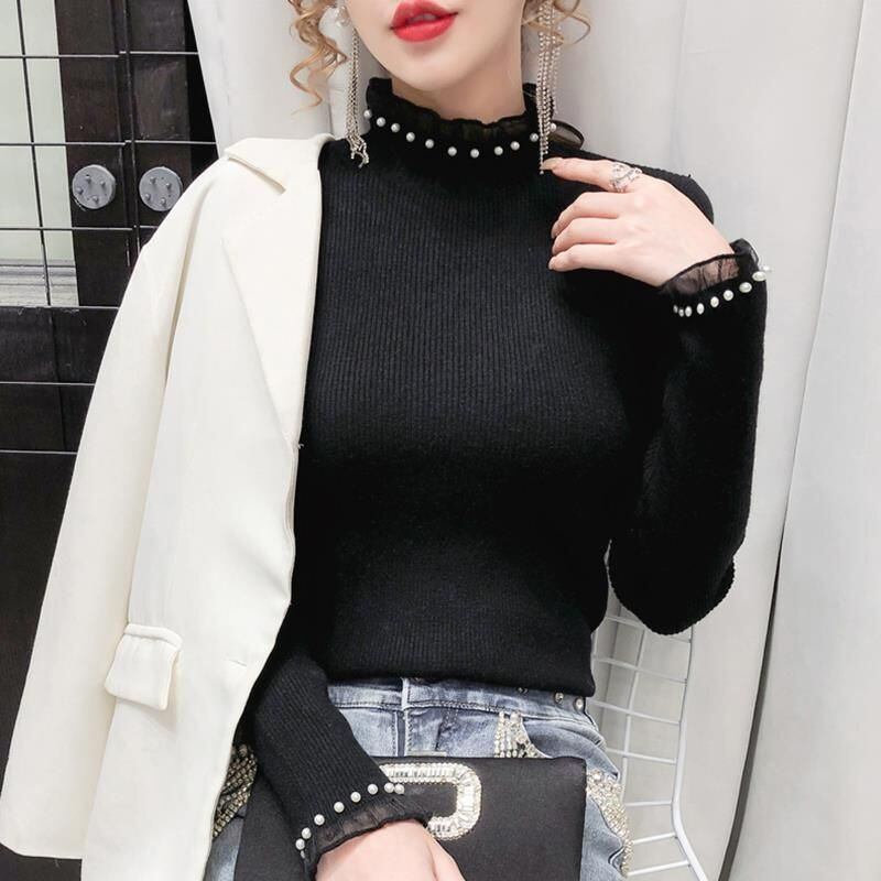 日焼け止めシャツパールメッシュセータースリムホワイトセータープル真菌ニット黒シャツプルオーバージャージトップス ブラック 真珠