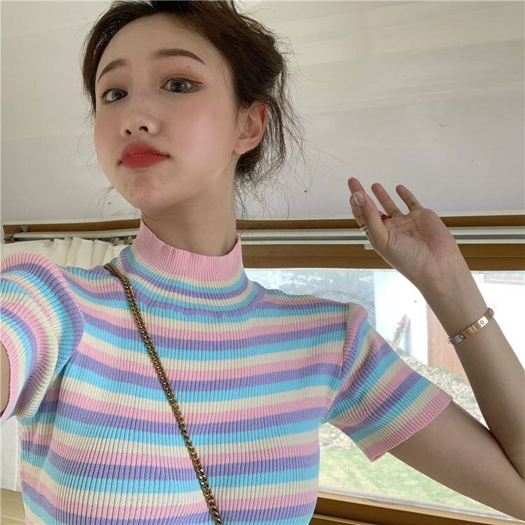 ハーフカラーレインボーストライプ Tシャツシャツスリムニットシャツグランジ服クロップトップ夏セーター サマー 夏物