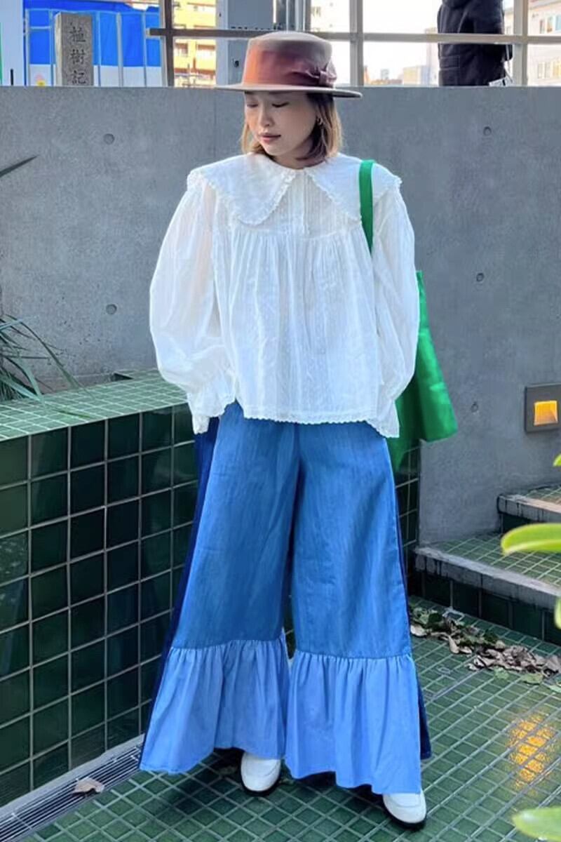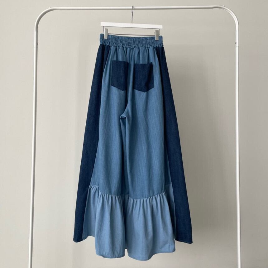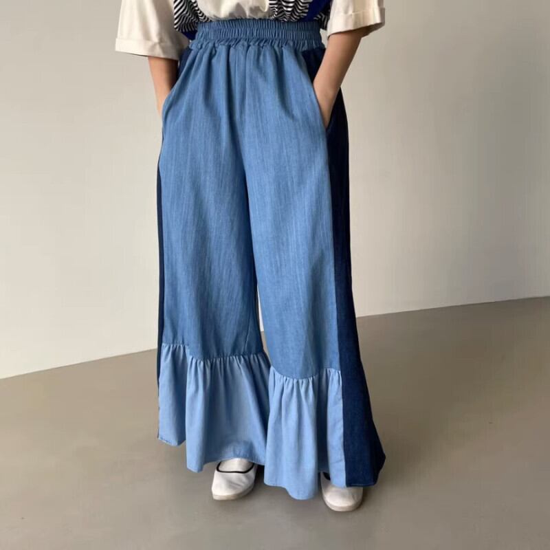弾性ウエストコントラストルーズワイドレッグジーンズフリルパンツスタイルだぶだぶパンツパンタロン エラスティック 伸縮 ワイドパンツ