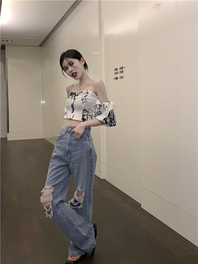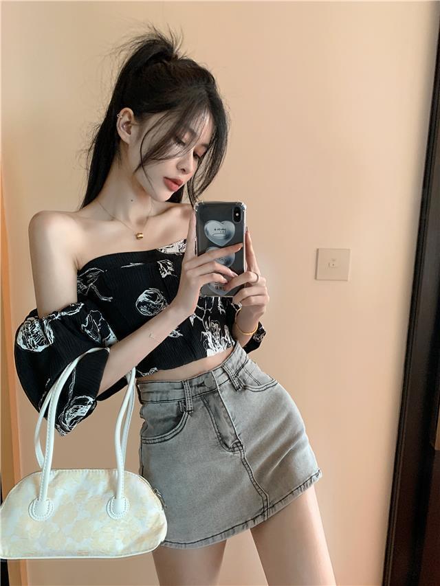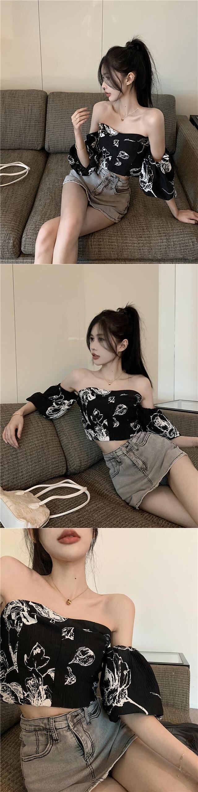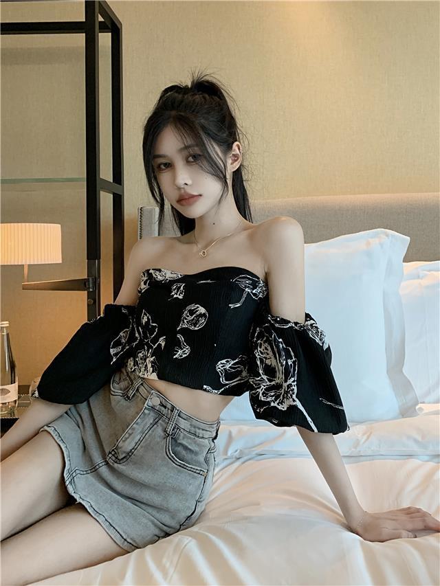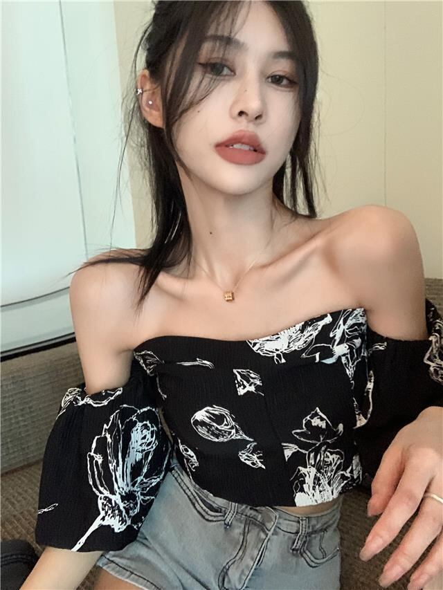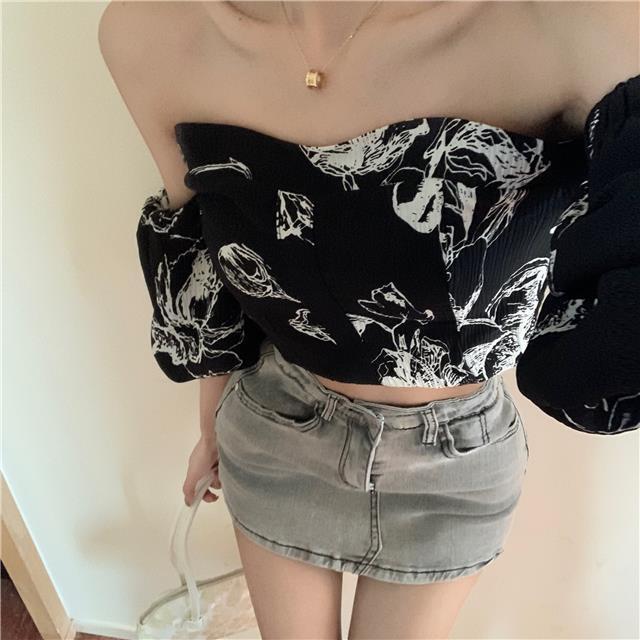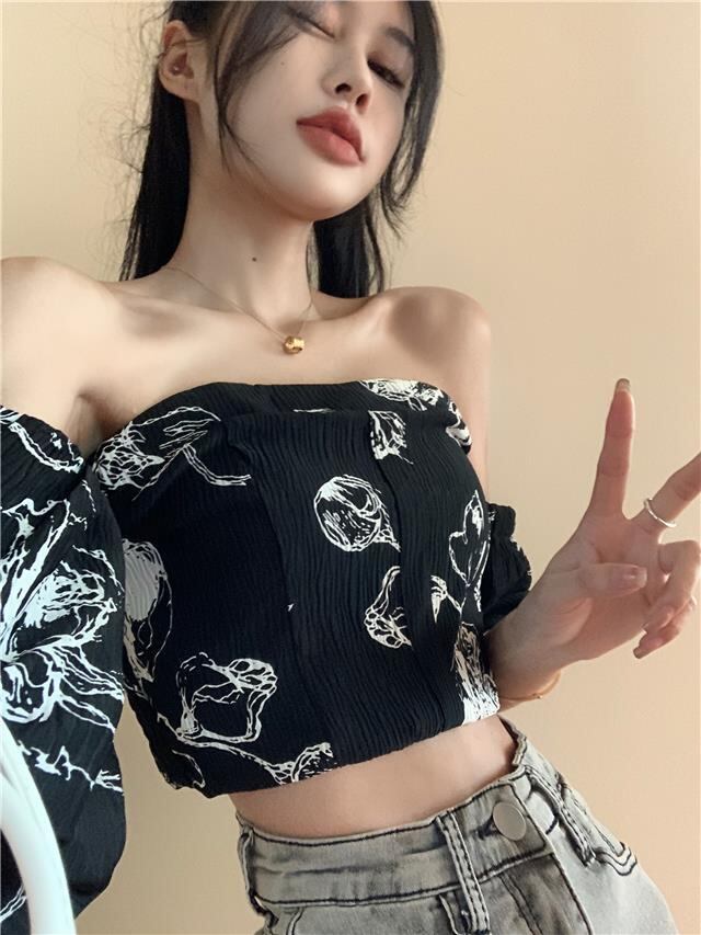 コルセット トップス セクシースラッシュ オフショルダー ブラウス スリム花柄シャツ プリント ブラック ホワイト シフォン シャツ