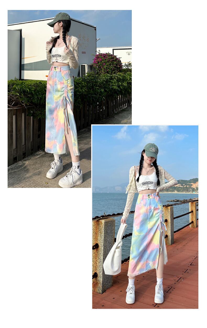 巾着カラータイダイデニムスカート Faldas Largas 原宿モーダ Y2k ペチコートロングミディ レッド かわいい