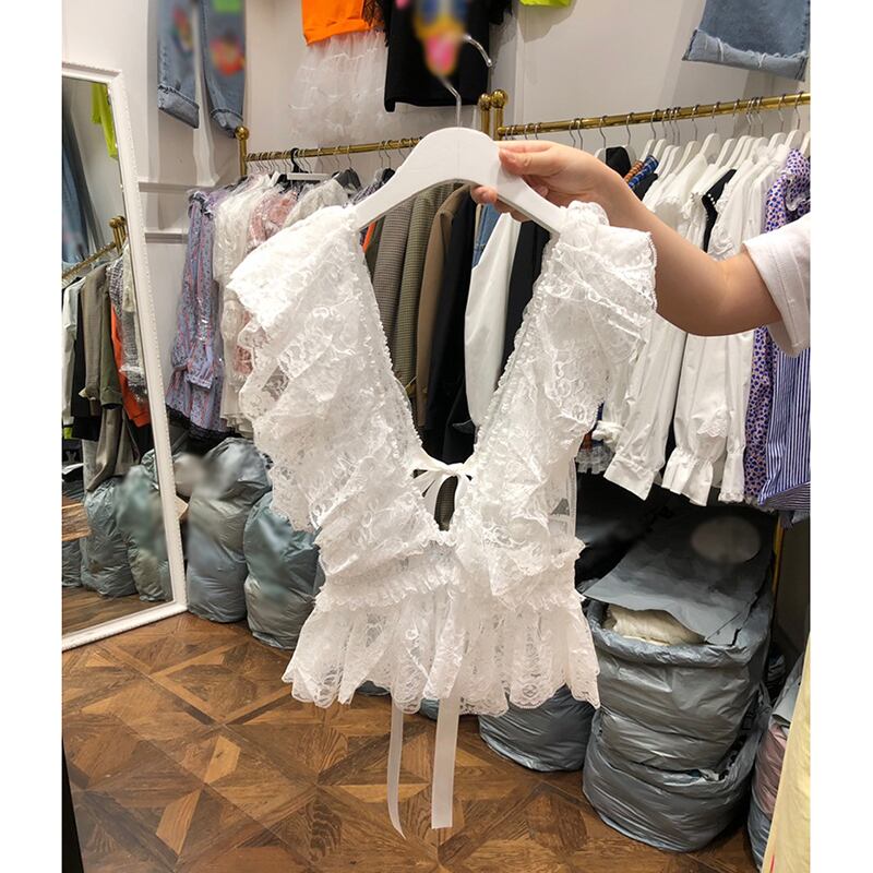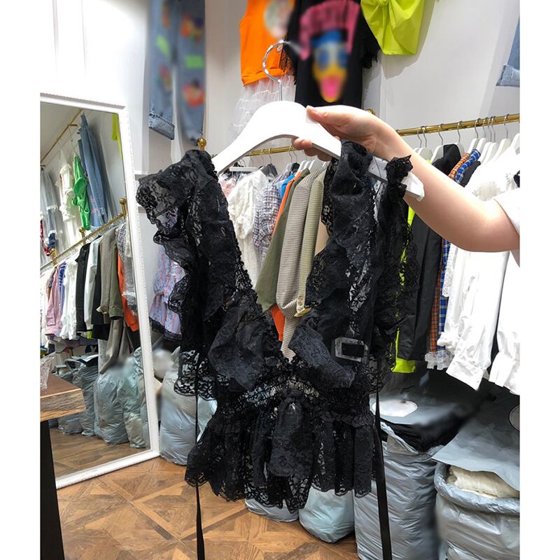 かぎ針編みセクシーブラックレースシャツ De Moda 中空アウトレースアップ V ネッククロップトップブラウス Vネック
