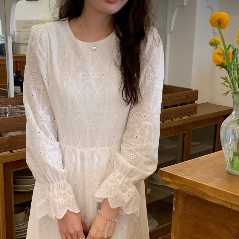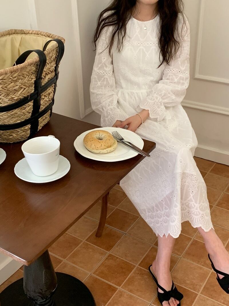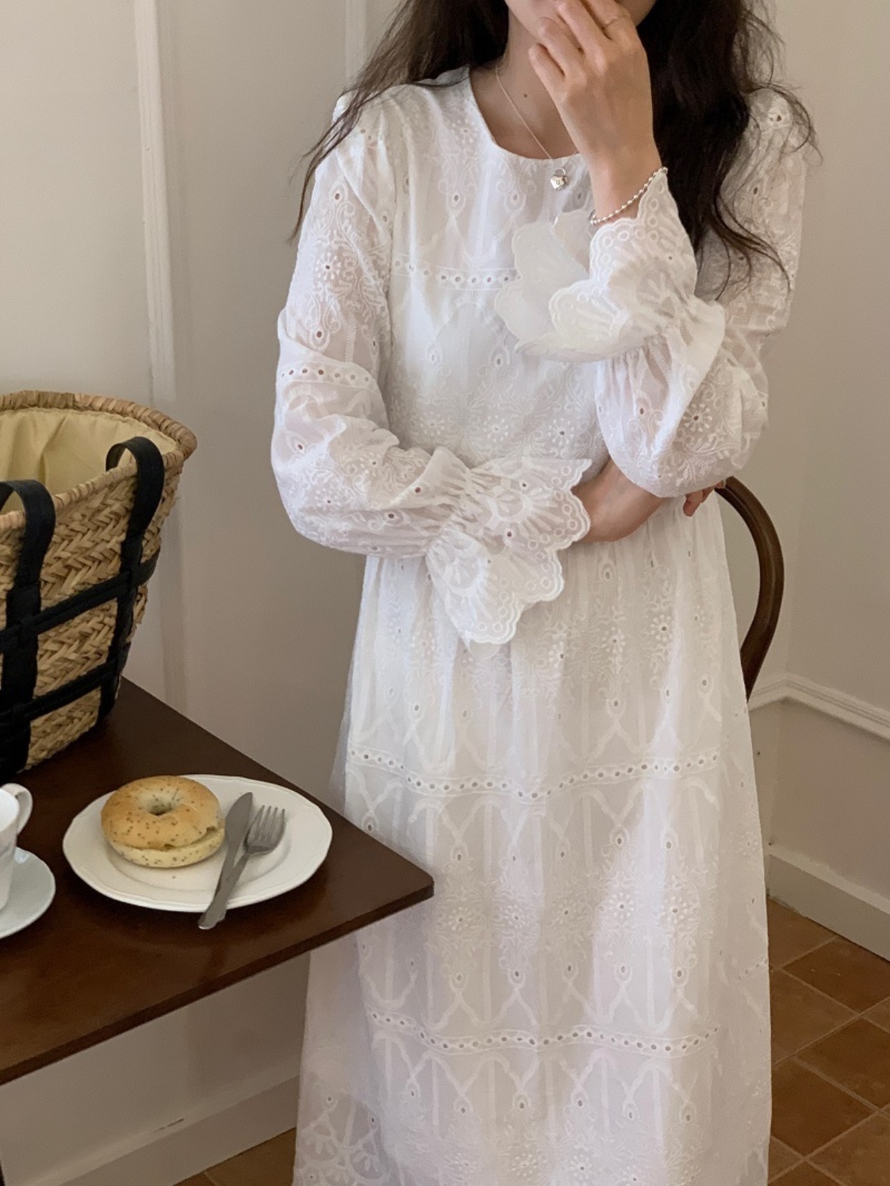 ストレートジャカード刺繍ドレス Vestidos デマキシドレス中空ホワイトレースロングドレスフレアパーティー