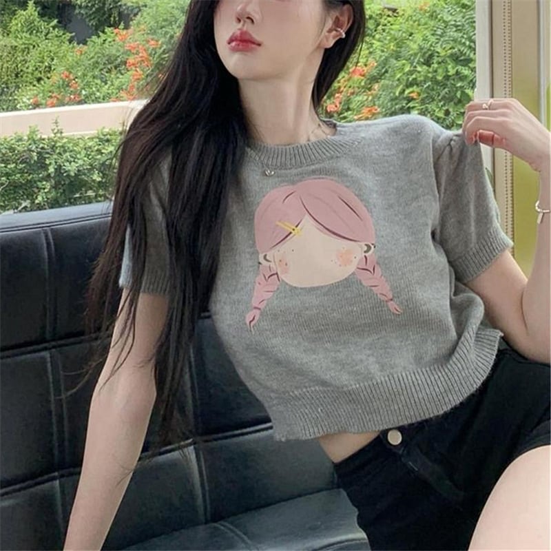 シャツグランジ Ropa 原宿 Y2k トップ漫画プリントグレー半袖 Tシャツ美的グラフィックニットセータートップ ショート ハーフスリーブ かわいい