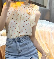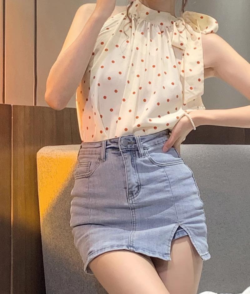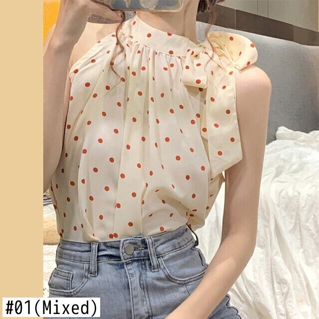 シャツオフショルダーホルタークロップトップシフォン水玉シャツブルーサブラウススリムシャツ