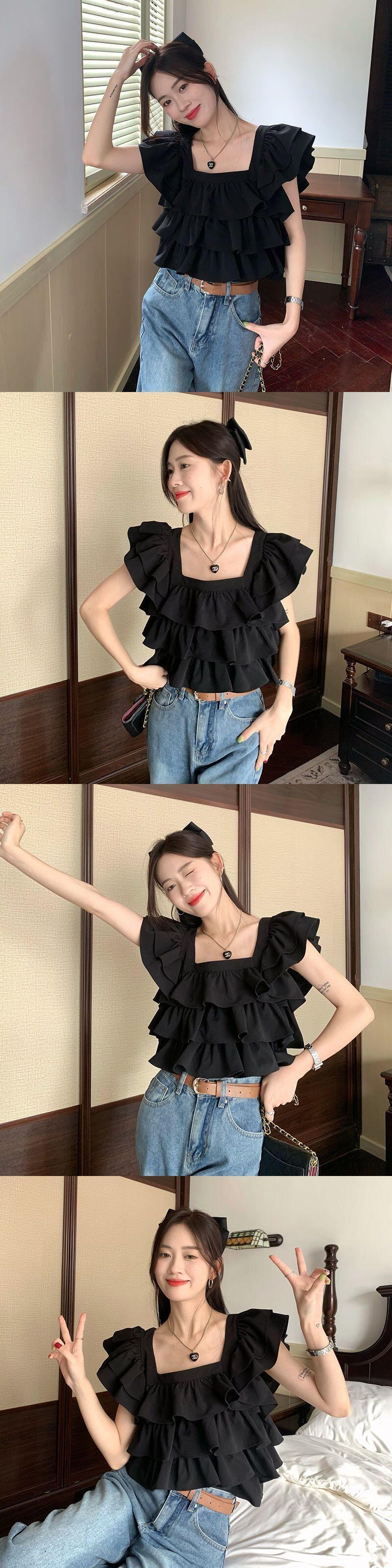 フレンチスタイルスクエアフリルフライスリーブシャツレースアップクロップトップスDe Modaホワイトドールシャツブラウス スクウェア