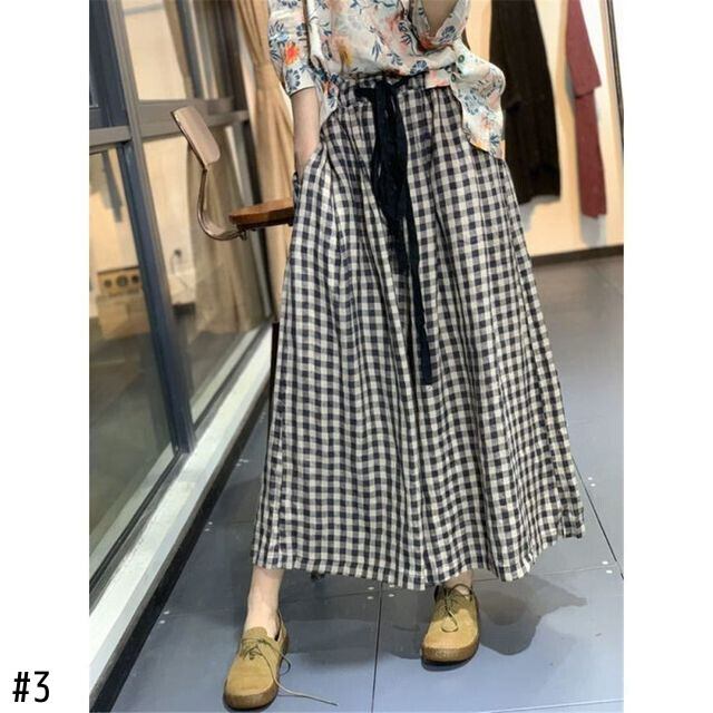弾性ウエスト綿とリネンズボンパンタロンワイドレッグチェック柄パンツカーゴパンツ原宿 コットン エラスティック 伸縮 かわいい ワイドパンツ