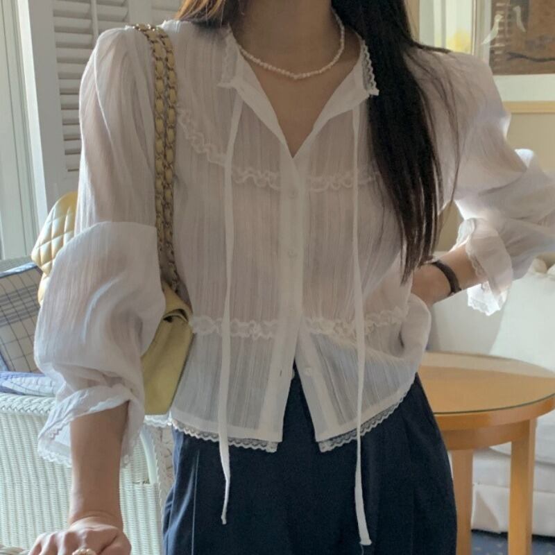 フリルレースアップルーズ日焼け止めシャツDe Moda白シャツドールシャツ ホワイト