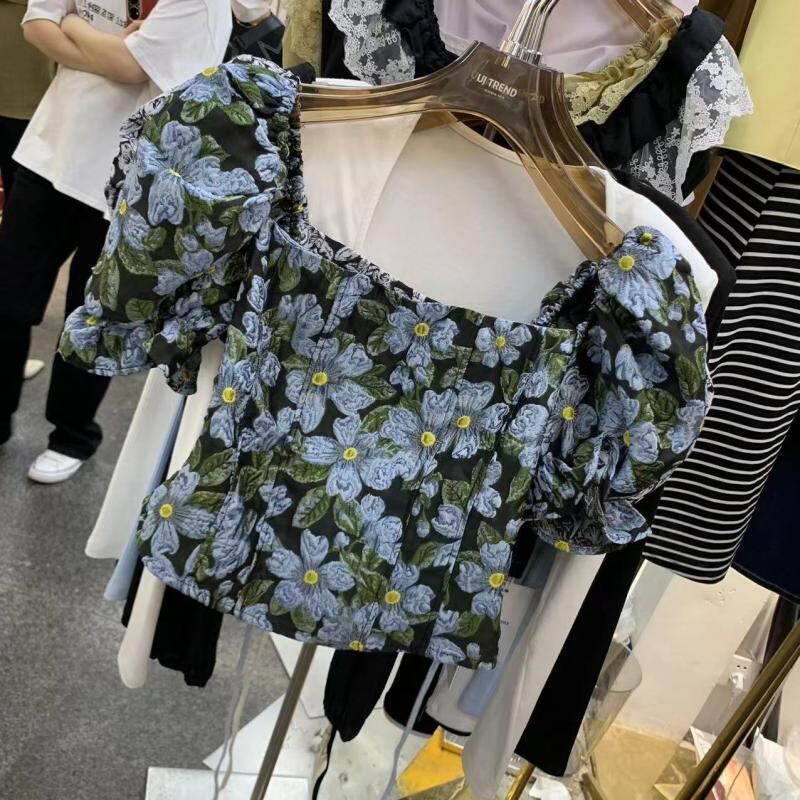 スクエアカラー ブラウス クロップトップス セクシー半袖シャツ スリム花柄シャツ De Moda シャツ ショート ハーフスリーブ スクウェア