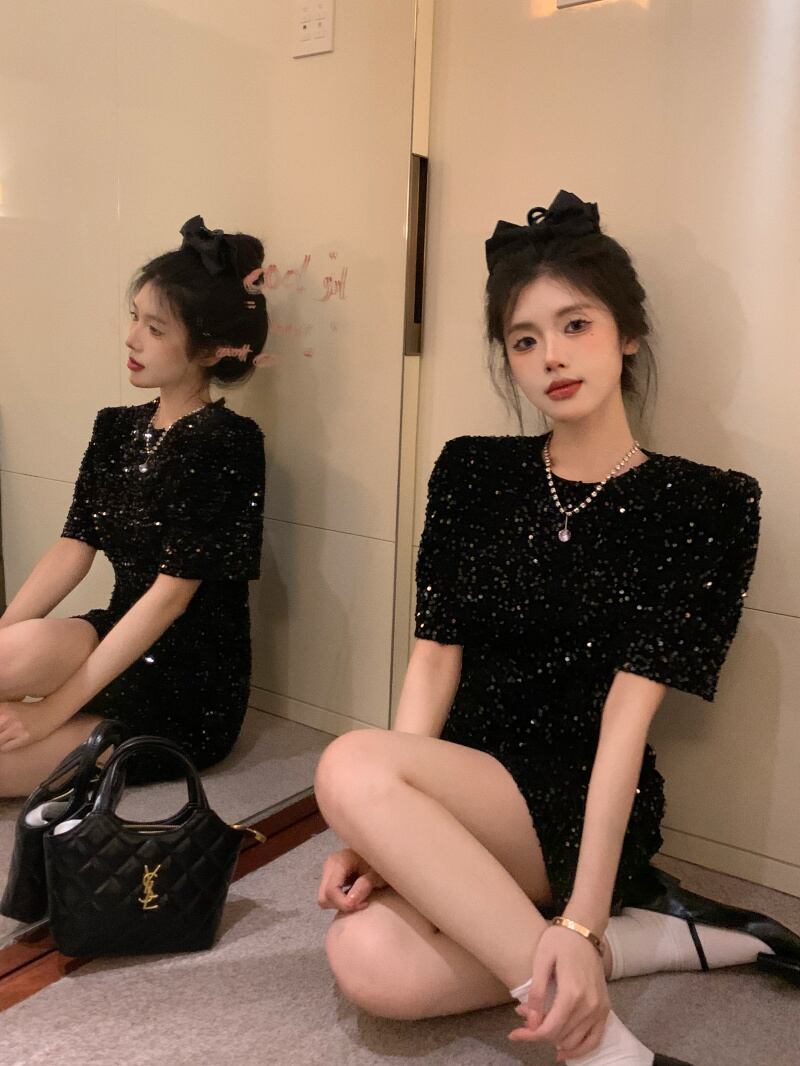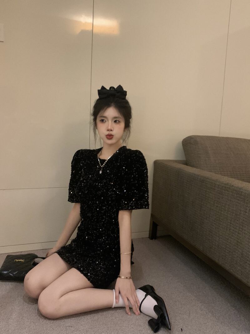 Y2k 春 Vestido Feminino ミニフレンチブラック半袖ベルベットスパンコールドレスパーティーセクシーボディコンスリム ショート ハーフスリーブ スプリング 春物