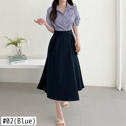 偽ツーピースストライプドレス Vestido マキシドレスウエスト不規則半袖シャツドレス Feminino ショート ハーフスリーブ