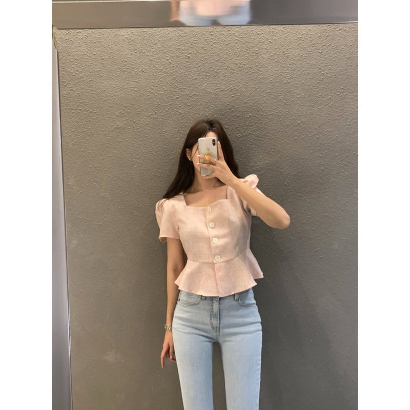 シャツスクエアシングルブレストチェック柄シャツツイードジャケットフリル半袖クロップトップブラウス ショート ハーフスリーブ スクウェア