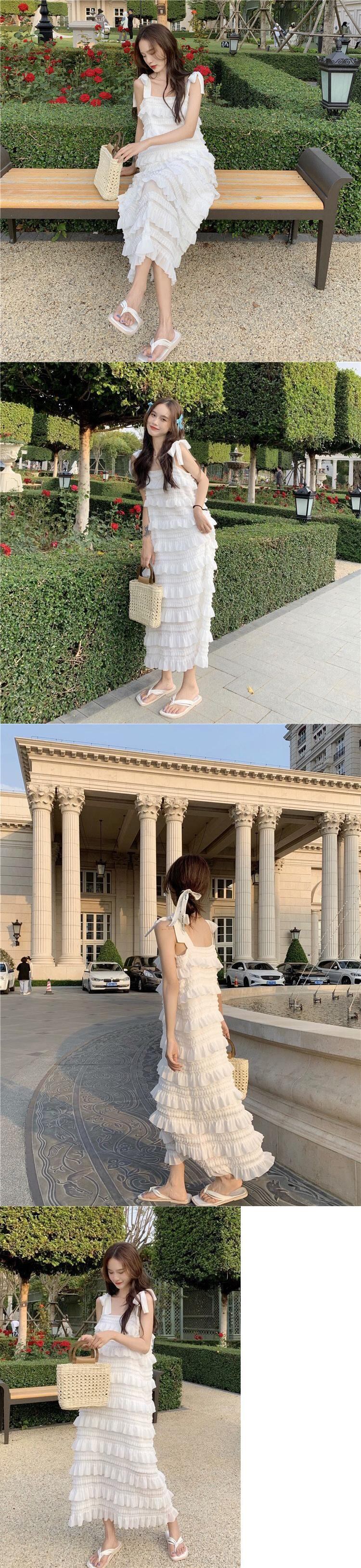 ロングドレス夏ルーズウエストストラップノースリーブ黒ストラップレスマキシドレス妖精トレンディホワイトケーキドレス ブラック サマー 夏物
