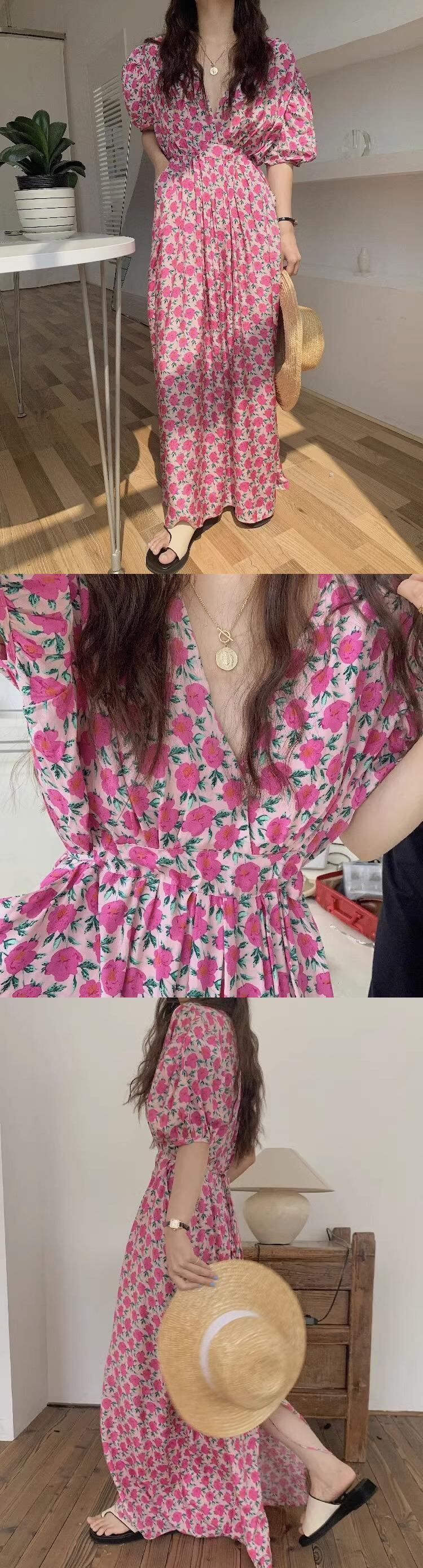 夏甘い V ネックフラワードレスレースアップウエストボヘミアンドレス Vestidos エスパラシフォン Y2k ドレススリム半袖 ショート ハーフスリーブ 大人ガーリー スウィート キュート カジュアル サマー 夏物 Vネック フラワーデザイン