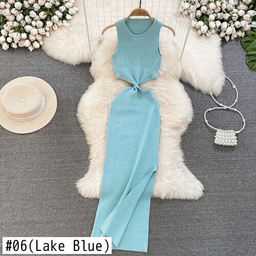 ニットドレス臀部スパイシーラウンドネックノースリーブ中空ウエストソリッド Vestidos デ 1 スリムローブ Y2k Oネック ソリッドカラー