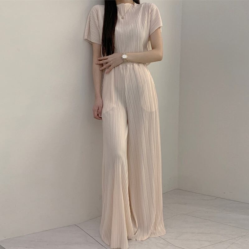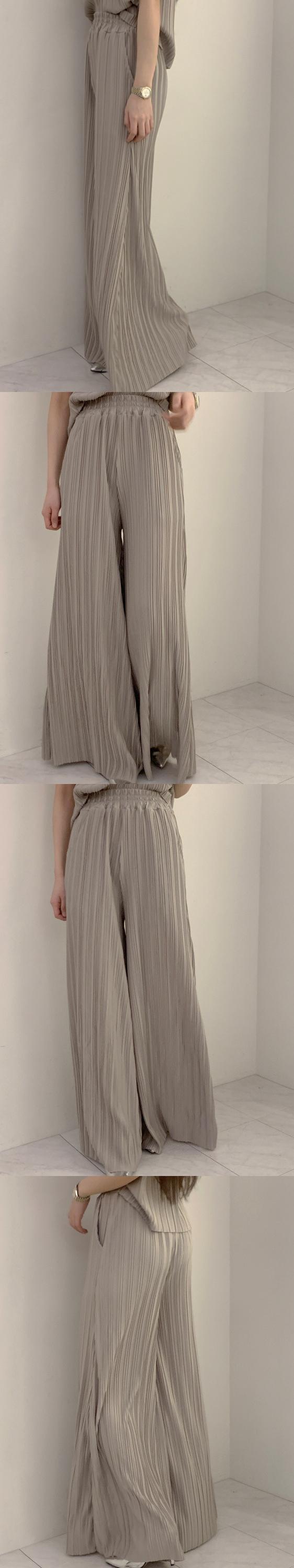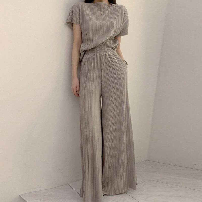 マッチングアイスプリーツ半袖シャツトップTシャツウエストワイドレッグパンツセットブラック2点セット ショート ハーフスリーブ ワイドパンツ シルク