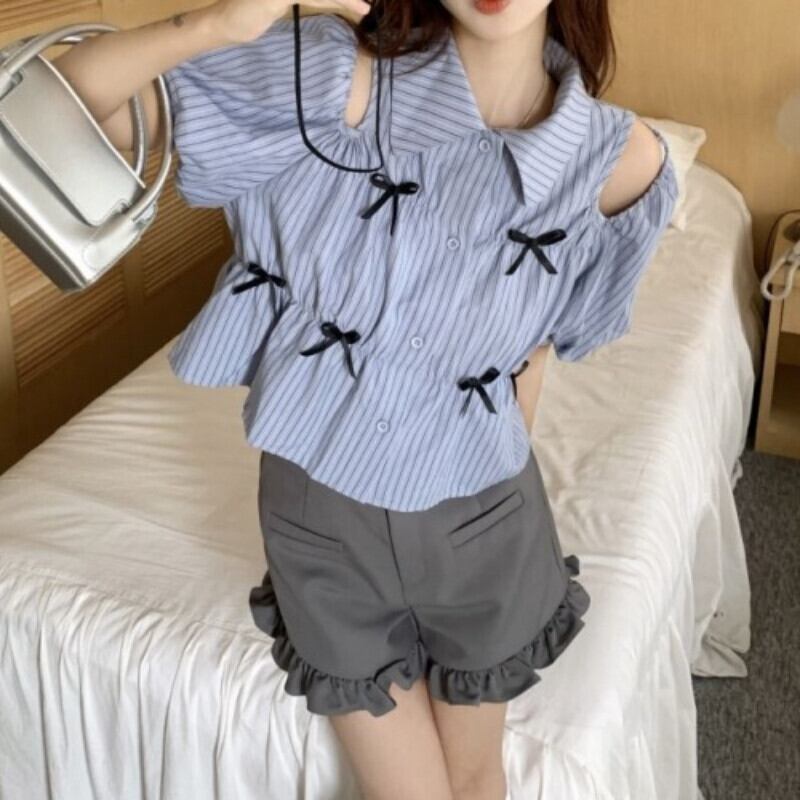 スリーブ ウエスト ラップ 中空アウト ドール シャツ es ブラウス ブルー ストライプ シャツ クロップ トップ ショート