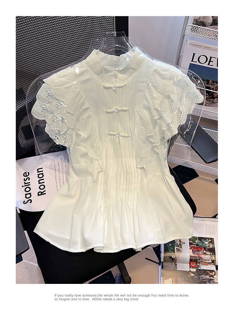ステッチホワイトレースシャツBlusaフライングスリーブシャツスタンドカラーノースリーブトップブラウス