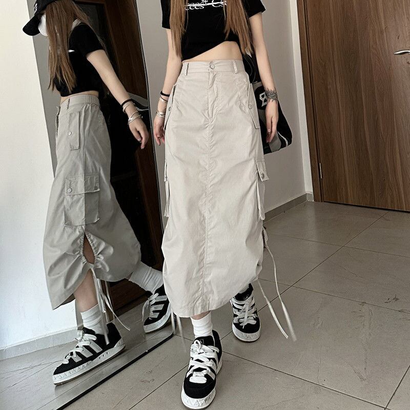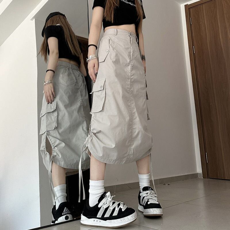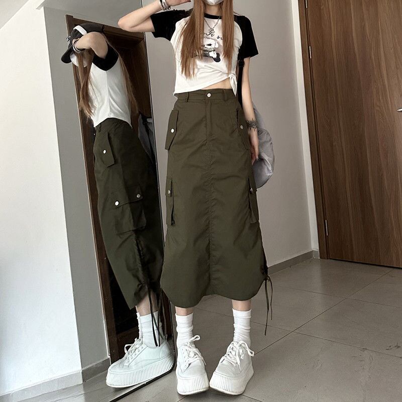 巾着アーミーグリーンスカートカーゴペチコートスタイルY2kスカートミディファルダプリーツスカートポケット