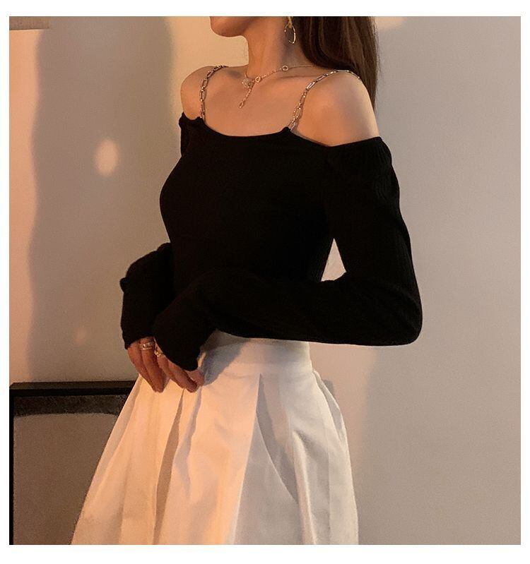 グラフィック Tシャツセクシークロップトップオフショルダーチェーン Tシャツ Camisetas シャツフルスリーブ Tシャツ Y2k 黒 Tシャツ ブラック