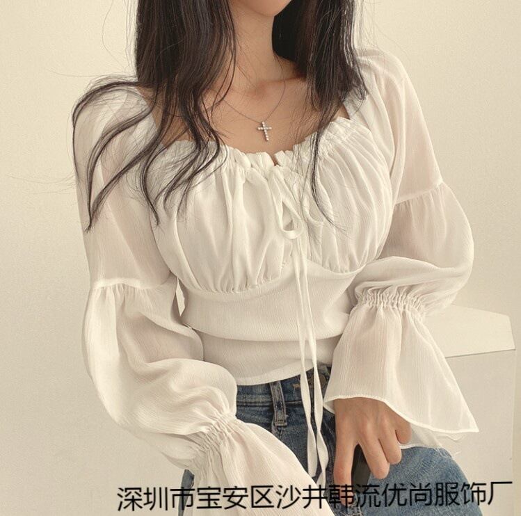 ファンガス レースアップ スクエア ウエスト スリム フレア スリーブ シフォン シャツ es クロップ トップ ブラウス ホワイト シャツ レッド スクウェア