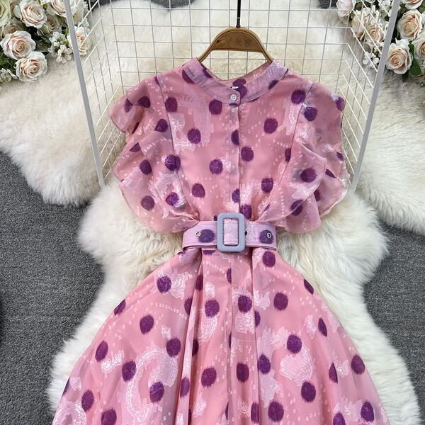 スタンドフリルスリーブウエストラップ A ライン大スイングピンク水玉ドレスローブ Vestido マキシドレス Aライン