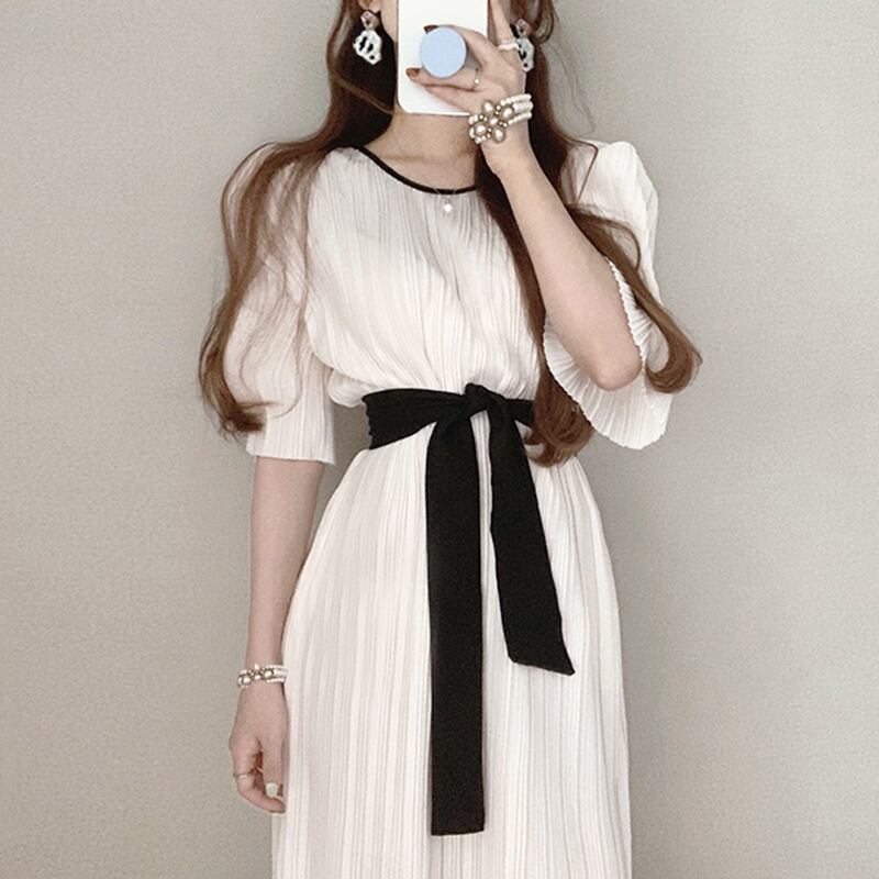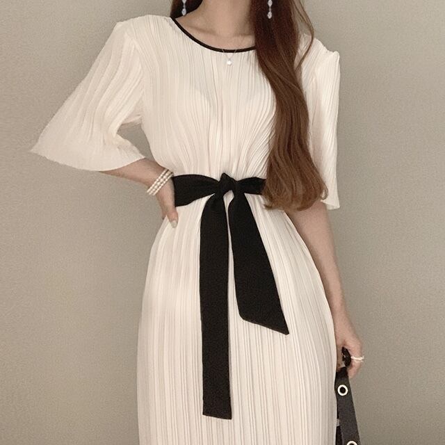 ボディコン Vestido フレンチスタイルラウンドネックコントラストプリーツストラップウエスト半袖ドレスローブ ショート ハーフスリーブ Oネック