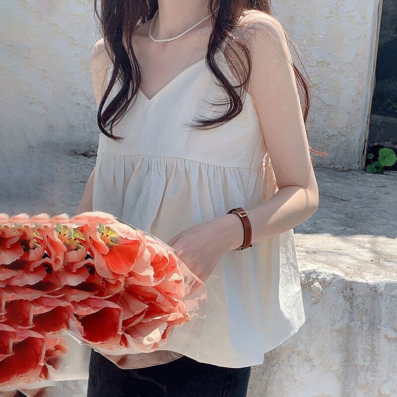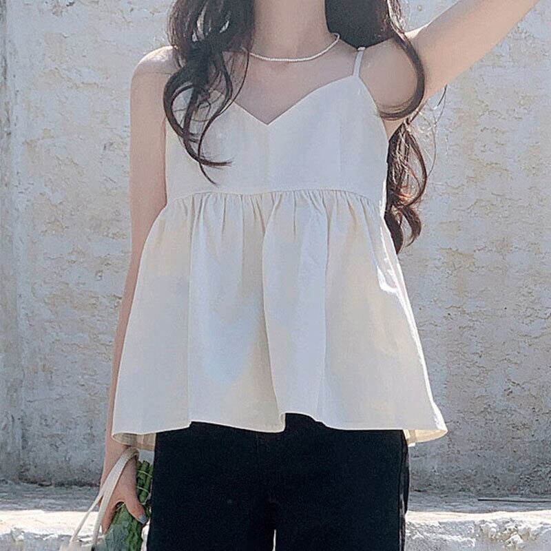 トップス&Tシャツ レディース ミニマリスト気質 Vネック クロップトップス フリル ルーズ ノースリーブ タンク Y2k ホワイト キャミソール ドール