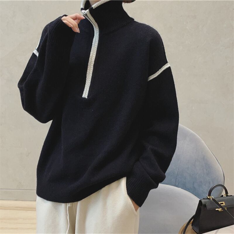 秋冬プルオーバースタンドカラーセーター特大ジャンパージャージプルセータージッパーストライプニットセータージャケット オータム 秋物 ウィンター 冬物
