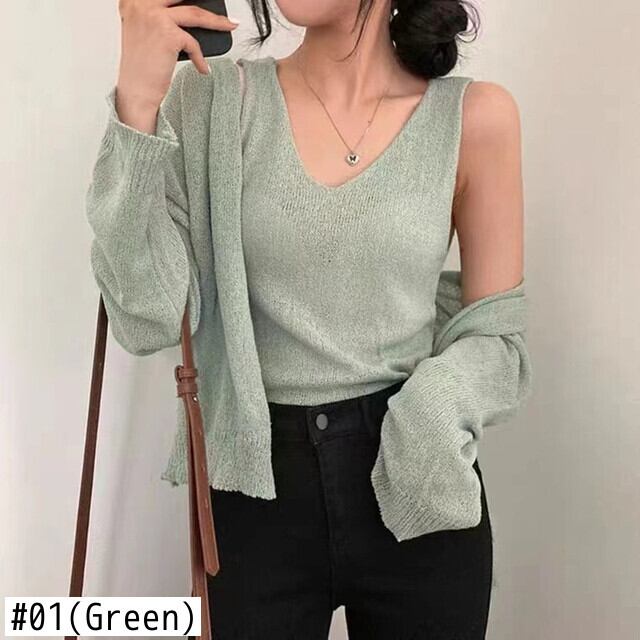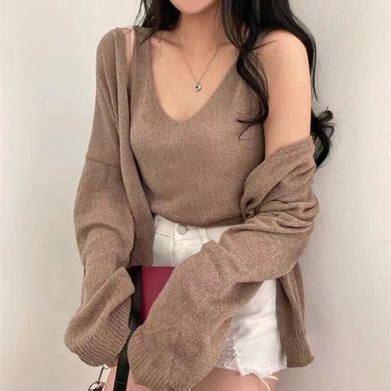 タンクトップ キャミソール ニット ルーズ 日焼け止めシャツ セーター 2 点セット V ネック カーディガン Feminino コート ベスト プル Vネック