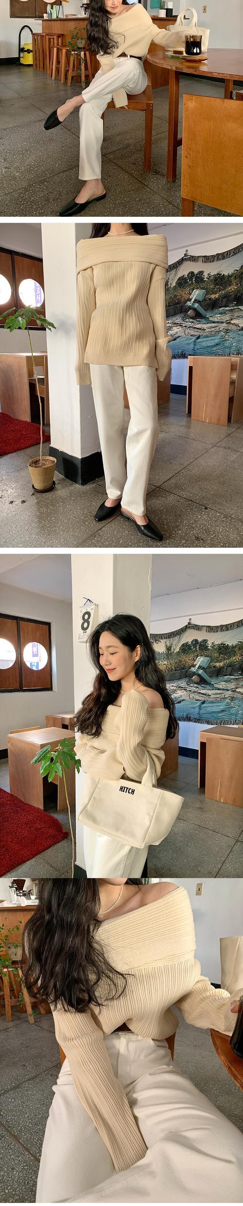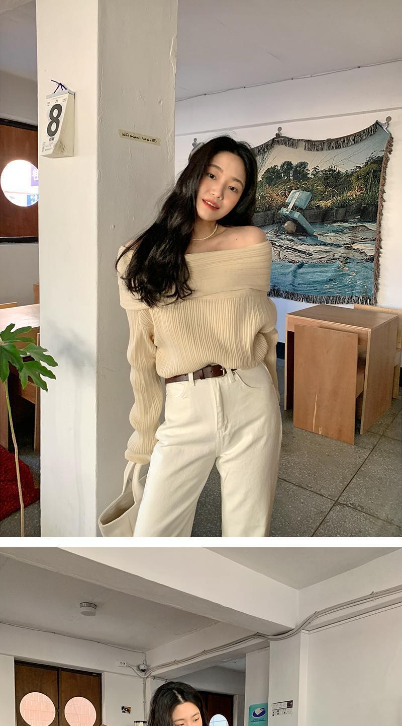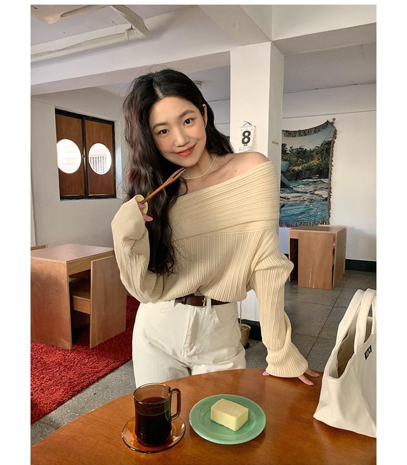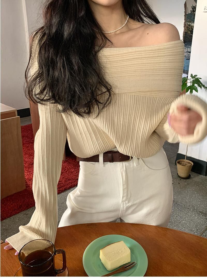 スラッシュネックオフショルダープルプルオーバーセーター長袖ブラックセータージャージニットシャツトップ ロング