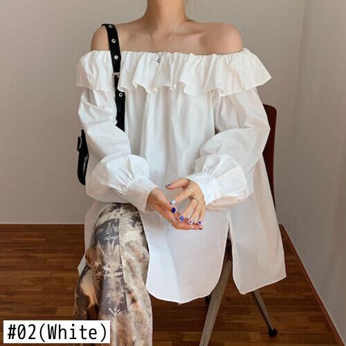 白シャツ初秋怠惰スタイルオフショルダー蓮葉エッジルーズ長袖シャツシックトップ ロング ホワイト オータム 秋物