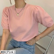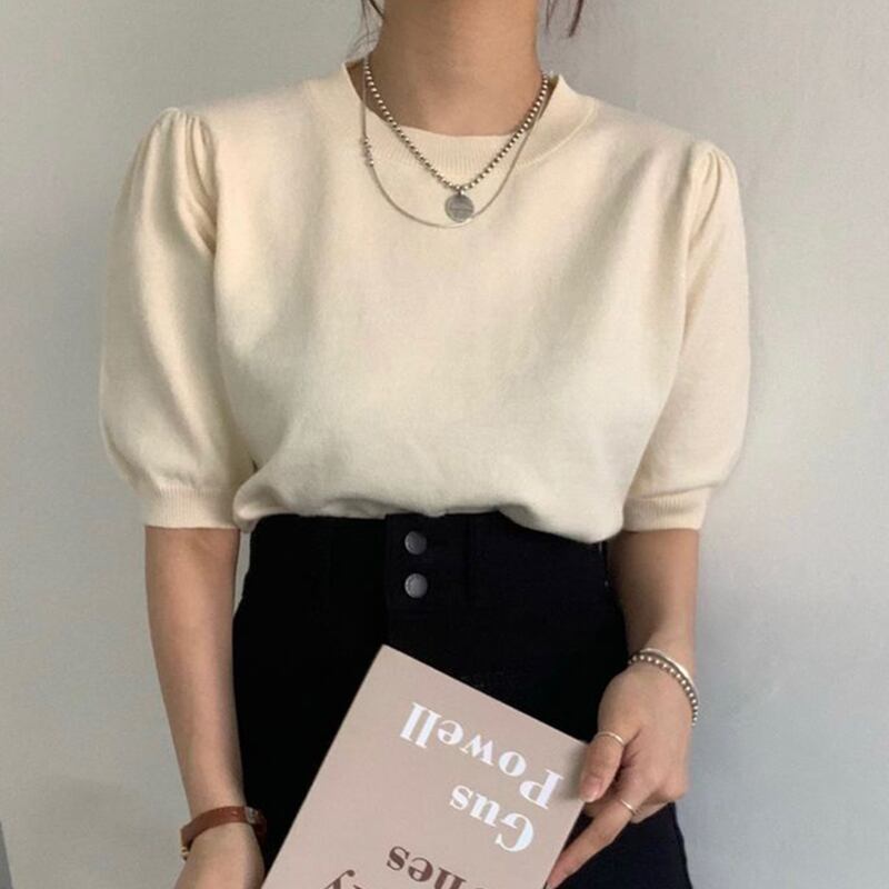 ラウンドネックプルオーバールーズソリッドバブル半袖ニットシャツキャンディーカラートップ Y2k 服ソリッドピンクセータープルセーター ショート ハーフスリーブ Oネック ソリッドカラー
