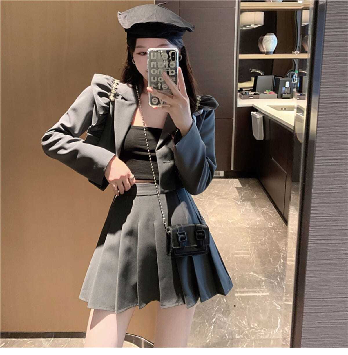 スカートスーツ作物黒ブレザーショートプリーツスカート段段段春秋 2 点セットレディース衣装オフィスレディジャケット ブラック スプリング 春物 オータム 秋物 会社 学校 通勤や通学にも
