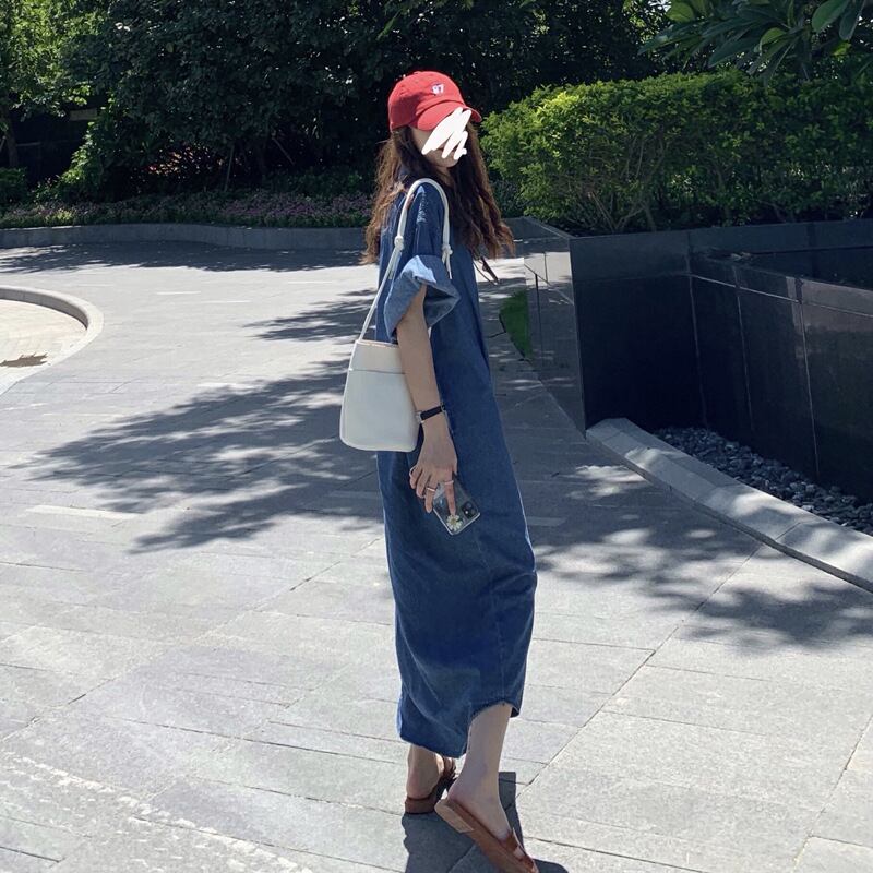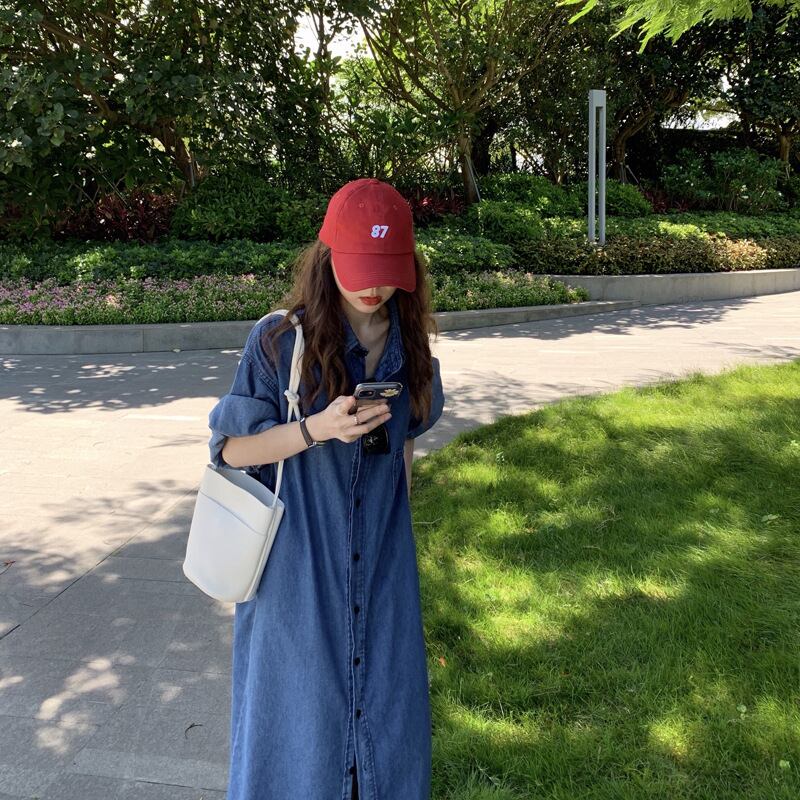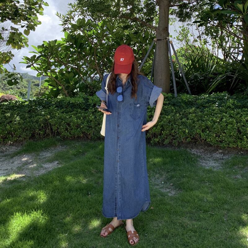 シングルブレストルーズフィット半袖デニムドレス Vestidos Y2k ドレスマキシスイングシャツドレスローブ ショート ハーフスリーブ