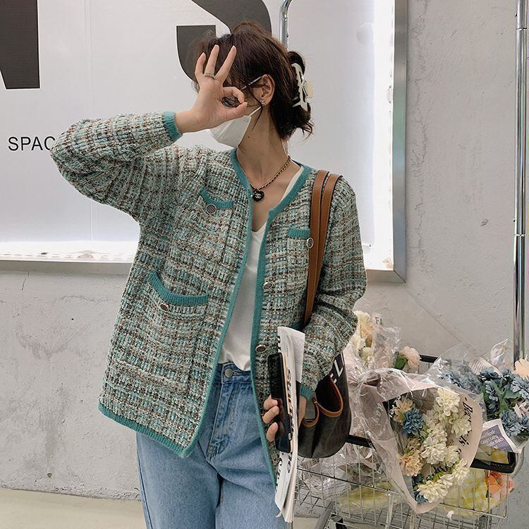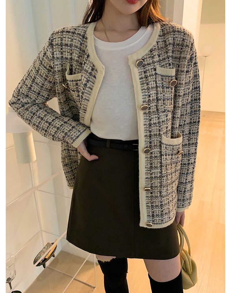 シングルブレストラウンドネックコントラストセーター黒ニットカーディガン Y2k 服セーター生き抜くジャケット ブラック Oネック