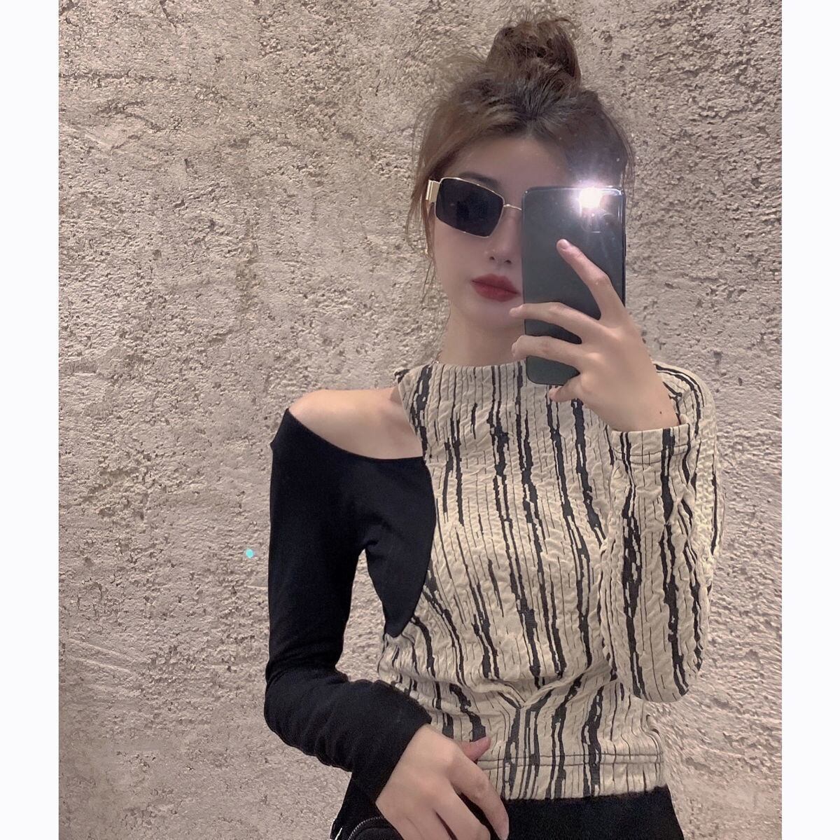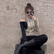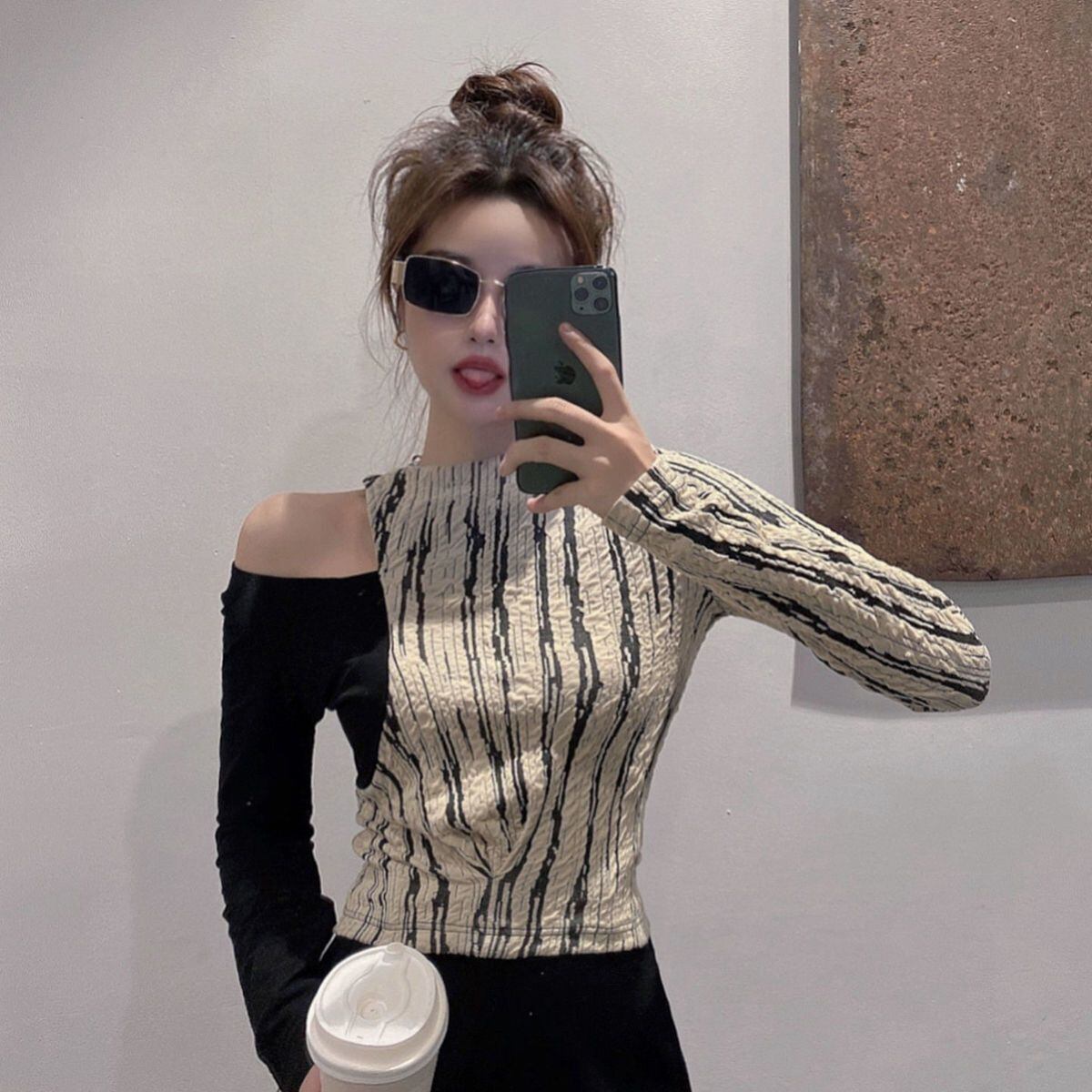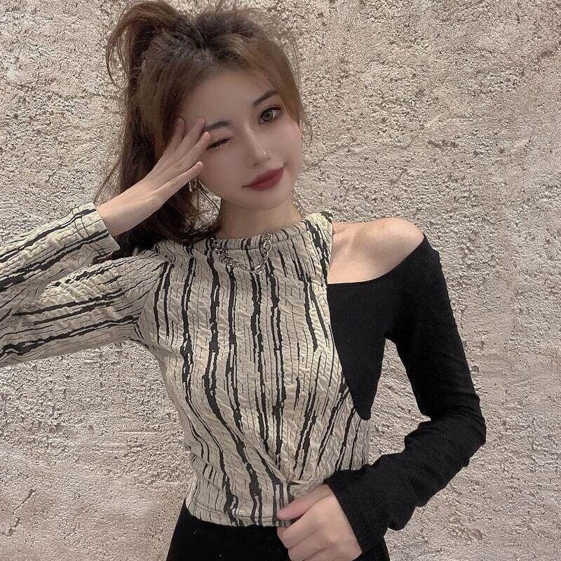 ロングオフショルダーセクシーストライプ Tシャツ Camisetas Y2k 服トップスホルターフェイク 2 Tシャツグラフィックステッチ春 スプリング 春物