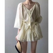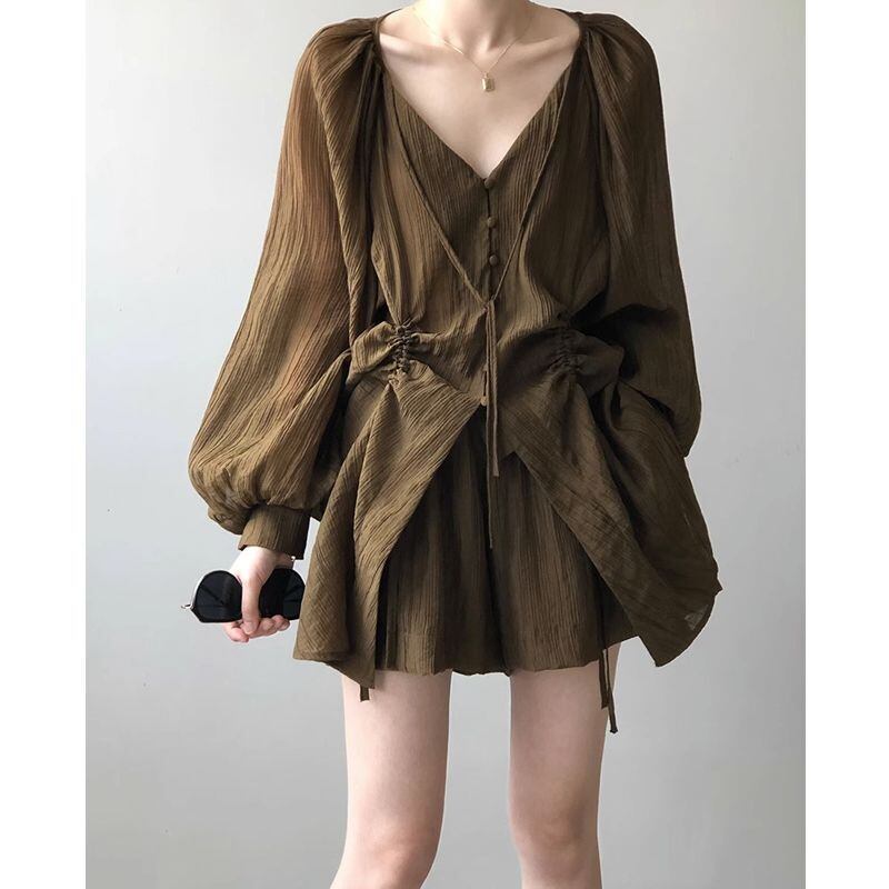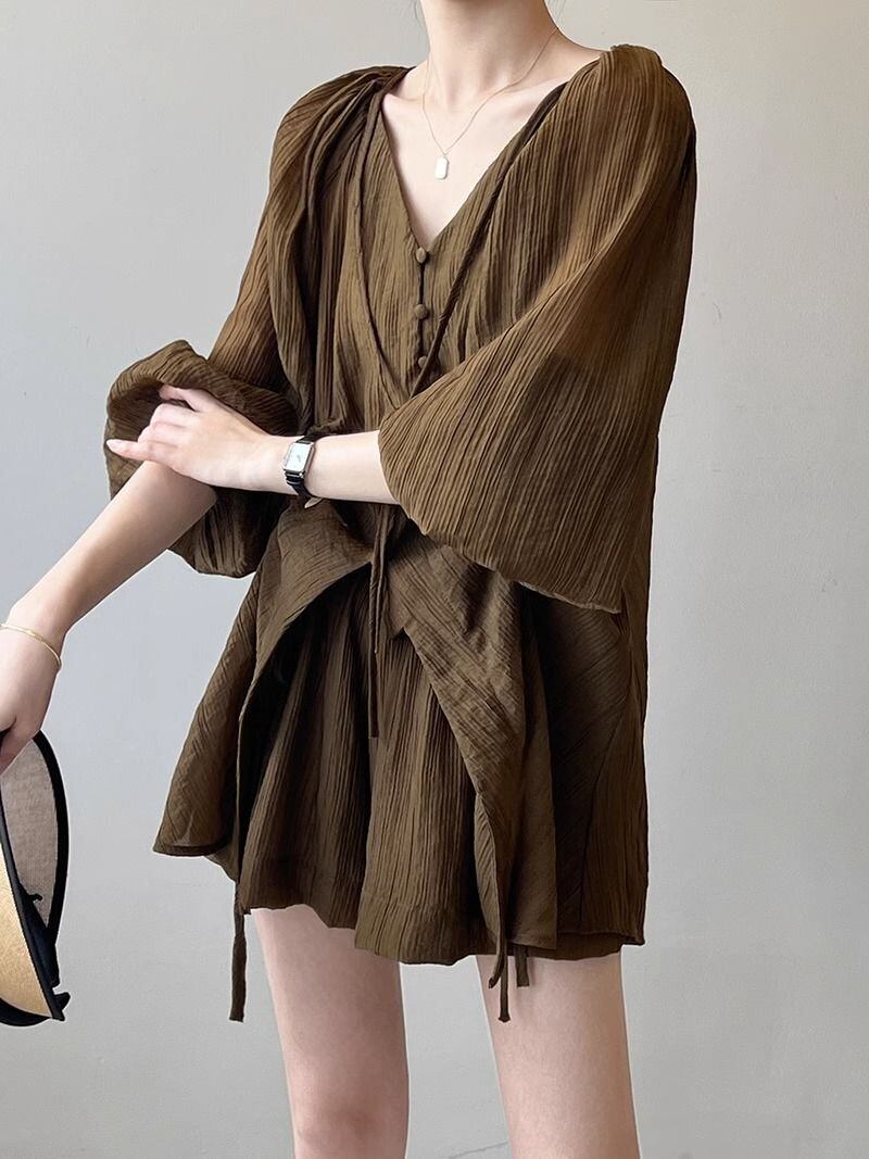 ショートセット V ネックレースアッププリーツシャツワイドレッグショーツ春展望シャツトップス 2 点セットブラウス スプリング 春物 ブルマー Vネック ワイドパンツ